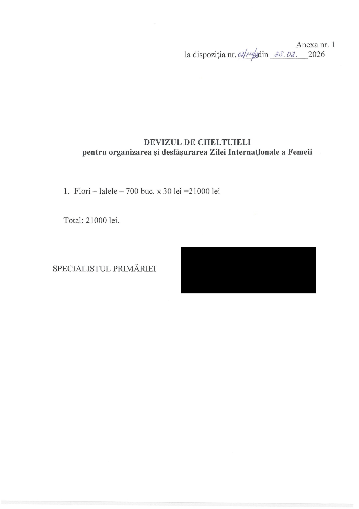 Conform dispoziției, autoritățile locale au aprobat și devizul de cheltuieli pentru organizarea evenimentului. Potrivit anexei documentului, bugetul este destinat achiziționării florilor ce vor fi oferite în cadrul acțiunii. Astfel, pentru eveniment vor fi cumpărate 700 de lalele, fiecare cu prețul de 30 de lei, suma totală alocată fiind de 21.000 de lei.