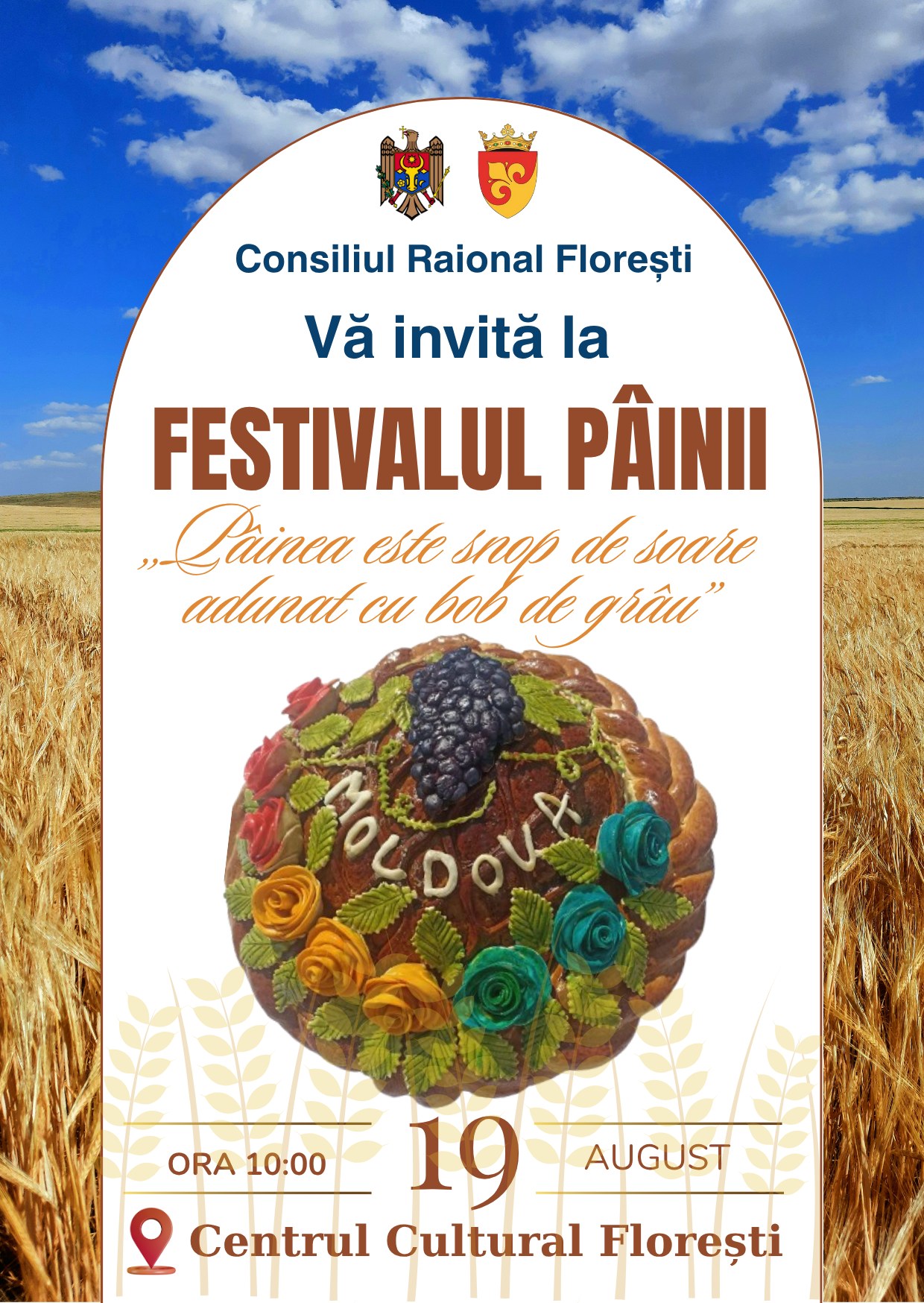 La19 august, se va desfășura mult așteptatul Festival al Pâinii. Evenimentul, organizat de Consiliul Raional Florești, va avea loc la Centrul Cultural Florești, începând cu ora 10:00, sub genericul: „Pâinea este snop de soare adunat cu bob de grâu”. Participanții sunt așteptați să guste nu doar din bunătățile tradiționale, ci și din atmosfera autentică a unui festival dedicat roadelor pământului și oamenilor harnici care le culeg.