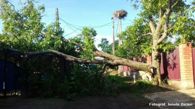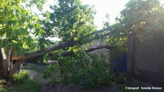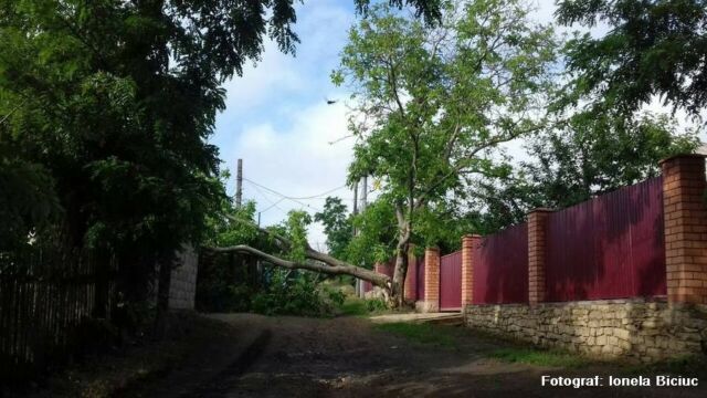 În satul Schineni, ploaia și rafalele de vânt din această noapte au doborât un copac de nuc, care a căzut peste drum și ograda vecină.