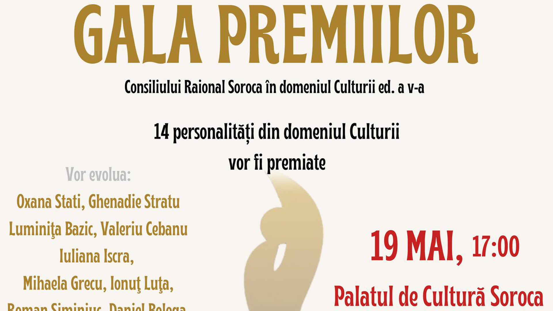 Organizată de Secția Cultură și Turism a Consiliul Raional Soroca, Gala Premiilor în Domeniul Culturii este un eveniment de tradiție, ajuns la a cincea ediție. În acest an, 14 personalități vor fi premiate pentru contribuțiile lor remarcabile în domeniul cultural. Festivitatea promite un spectacol deosebit, unde cultura și tradițiile locale vor fi celebrate prin muzică, dans și recunoașterea meritelor celor implicați.