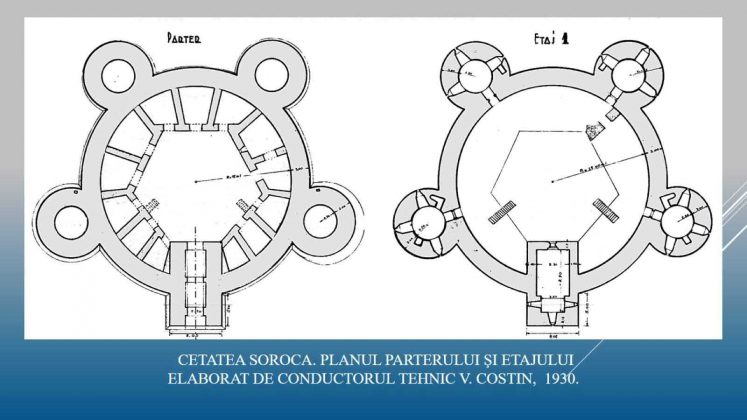 În cazul cetății Soroca, un pentagon regulat imaginar, ale cărui vârfuri sânt marcate de turnuri de apărare, este prins într-o incintă de plan circular. Patru turnuri din cinci (exceptând cel de acces) au la baza planului un cerc. Cercul e o figură geometrică cu valoare mistică încă din antichitate (prototipuri -soarele și luna plină). El e simbolul veșnicei perfecțiuni și reînceperi, al mișcării imuabile și eterne fără început și sfârșit. Nu întâmplător multe popoare ale lumii atribuie cercului funcția de protecție de forțele malefice -de aici provin formele circulare ale locuințelor, stânelor, taberelor militare și brazdelor magice ce înconjoară așezările în cazuri de primejdie. în același timp, incintele circulare propun cel mai mic perimetru pentru cea mai mare arie apărată.