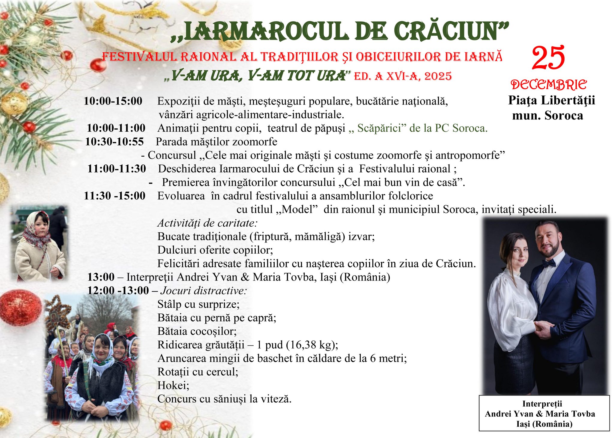 Spiritul sărbătorilor de iarnă a cuprins municipiul Soroca, unde astăzi, 25 decembrie, are loc ediția a XVI-a a Festivalului Raional al Tradițiilor și Obiceiurilor de Iarnă „V-am ura, v-am tot ura”. Evenimentul, desfășurat chiar acum în Piața Libertății, adună comunitatea în jurul tradițiilor autentice, muzicii populare, jocurilor și obiceiurilor strămoșești, într-o sărbătoare care transformă orașul într-un veritabil sat de Crăciun.