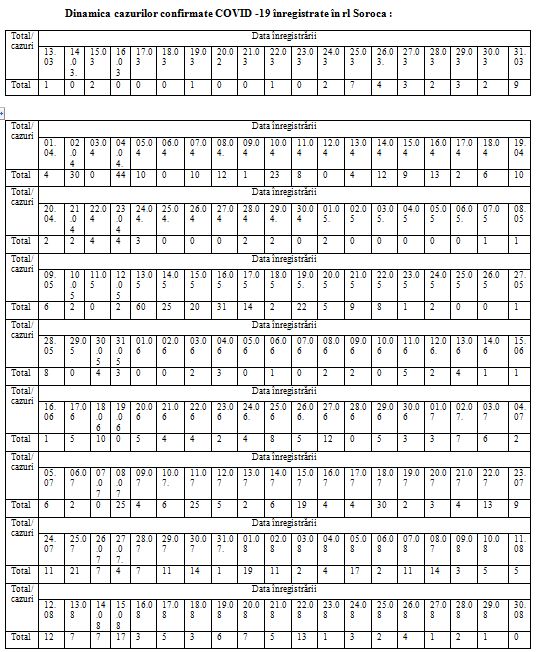 Altfel, ieri în raionul Soroca au mai fost depistate 20 de persoane infectate, dintre care 14 persoane în oraș și 6 persoane în localitățile rurale. La data de 29 martie, în raionul Soroca erau înregistrate 194 cazuri active de Covid – 83 de cazuri în municipiu și 111 cazuri în satele raionului.