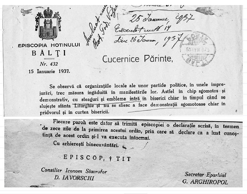 Și încă ceva. La redacție au parvenit primele semnale de implicare în politică a bisericii. Nu voi da nume și adrese, dar trebuie să recunoaștem că acest fenomen regretabil s-a înregistrat și anterior. Dar și mai semnificativ este altceva — astfel de metamorfoze au avut loc și în vremuri mai vechi, lucru confirmat și de un document din 15 ianuarie 1937 adus la redacție de domnul Nicolae Bulat. În ordinul semnat de Episcopia Hotinului se spune că…„organizațiile unor partide politice trec măsura în manifestările lor. În chip zgomotos și demonstrativ, cu steaguri și embleme intră în biserici chiar în timpul când se slujește sfânta Liturghie și nu se sfiesc a face demonstrații zgomotoase chiar în pridvorul și în curtea bisericii… Preoții care se vor dovedi că îngăduie și tolerează asemenea manifestațiuni vor fi pasibili de cele mai aspre măsuri disciplinare”. Ce-i drept, astăzi nu s-a ajuns, încă! până la astfel de „demonstrații zgomotoase”, dar o preîntâmpinare pentru preoții care tolerează comportamentul fariseic al unor politicieni chiar nu ar strica…