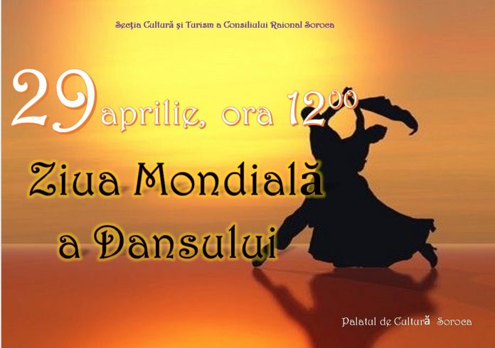Secţia Cultură şi Turism a Consiliului Raional Soroca invită sorocenii și oaspeții orașului la concertul dedicat Zilei Mondiale a Dansului. Evenimentul cultural va avea loc la 29 aprilie 2022, de la ora 12:00, la Palatul de Cultură Soroca.