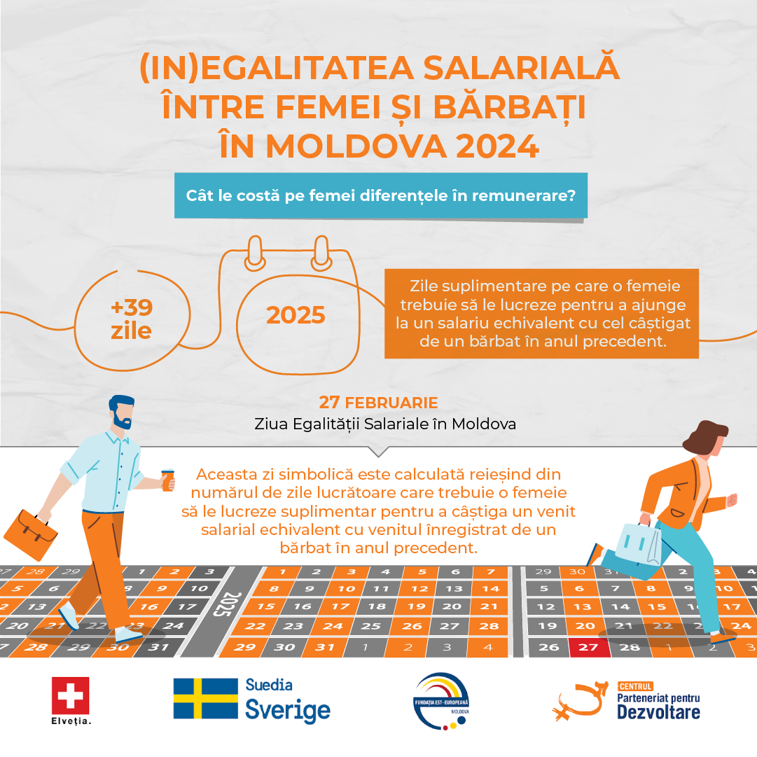 Pe data de 27 februarie marcăm Ziua Egalității Salariale în Moldova. Așa cum a devenit o tradiție de un deceniu deja, Centrul Parteneriat pentru Dezvoltare (CPD), în baza datelor Biroului Național de Statistică privind câștigul salarial al femeilor și al bărbaților, determină ziua calendaristică care marchează această zi. Conform calculelor pentru anul 2025 o femeie trebuie să lucreze până la data de 27 februarie pentru a atinge valoarea câștigului salarial al unui bărbat în anul precedent. În termeni monetari, pierderea financiară anuală a femeilor a atins valoarea de 29 502 lei în 2023, adică femeile au primit cu 15,6% mai puțin decât bărbații, scrie în nota analitică a CPD.