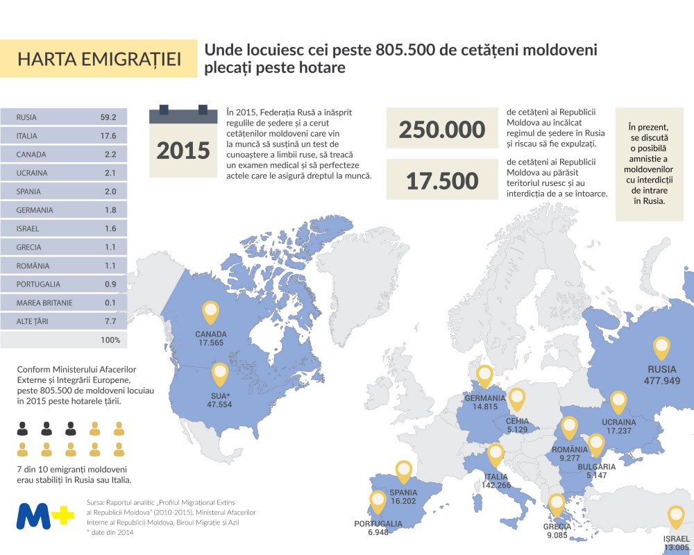 Zeci de mii de oameni pleacă anual din Republica Moldova pentru a-și găsi un loc de muncă mai bine plătit. Conform datelor adunate de la oficiile consulare ale țării, peste 805.000 de moldoveni locuiau peste hotare în 2015, practicând munci formale și informale.