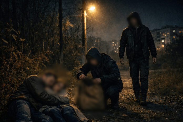 Profitând de faptul că victima era căzută la sol, unul dintre agresori a început să-i caute prin buzunare. Din buzunarul pantalonilor a fost sustrasă suma de 100 de lei. În același timp, cel de-al doilea atacator a încercat să o împiedice pe femeie să strige după ajutor și să telefoneze la poliție.