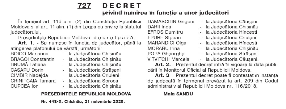 În Monitorul Oficial a fost publicat Decretul președintei Republicii Moldova, Maia Sandu, prin care numește mai mulți judecători în funcție până la atingerea plafonului de vârstă. Potrivit documentului, la Judecătoria Soroca va activa doamna Tamara Crinițcaia.