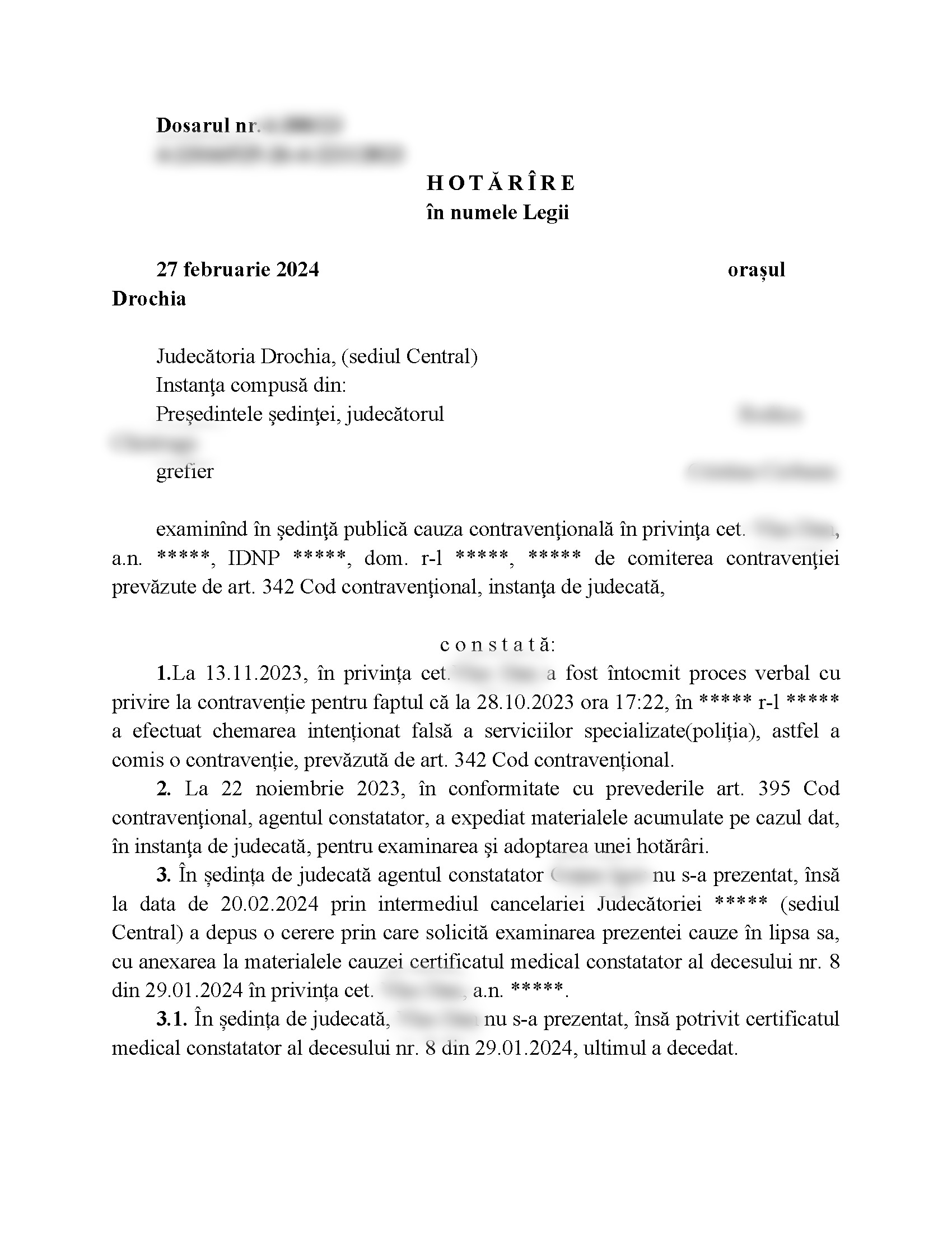 Agentul constatator a transmis anterior, prin intermediul cancelariei Judecătoriei, certificatul medical constatator al decesului făptașului datat cu sfârșitul lunii ianuarie. „Necătând la faptul decesului cetățeanului, vinovăția sa se dovedește prin probe” se menționează în textul sentinței, unde se scrie că pe motivul morții acestuia, procesul contravențional se încetează. Cu toate acestea instanța a hotărât să-l recunoască vinovat pe făptașul trecut în lumea celor drepți. Hotărârea este cu drept de recurs în Curtea de Apel Bălţi în termen de 15 zile.