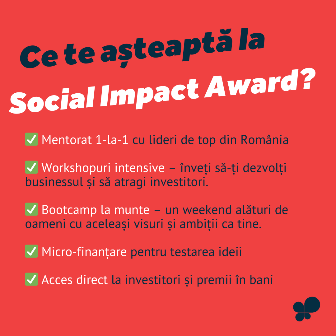 Social Impact Award se desfășoară în prezent în 23 de țări, fiind un reper internațional în promovarea antreprenoriatului social în rândul tinerilor. În România și Republica Moldova, programul contribuie anual la formarea unei noi generații de inovatori sociali, care îmbină viziunea antreprenorială cu dorința de a construi o societate mai echitabilă și sustenabilă. Programul este implementat cu sprijinul partenerilor noștri strategici: BCR Social Finance, Erste Stiftung și SAP – cărora le mulțumim pentru susținerea unei noi generații de antreprenori sociali.