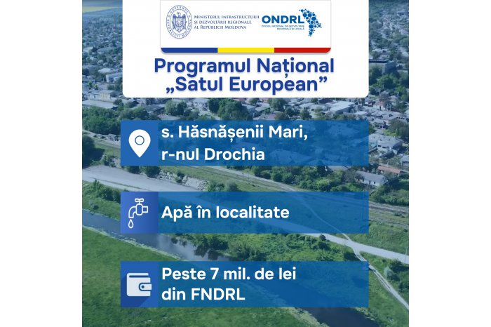 Circa 1500 de locuitori ai satului Hăsnășenii Mari, raionul Drochia, beneficiază de apă în gospodării, după finalizarea unui proiect de infrastructură inclus în Programul „Satul european”. Lucrările au fost efectuate cu sprijinul Guvernului și au implicat construirea a 22 de kilometri de rețea de alimentare cu apă și a două turnuri de apă, transmite moldpres.md