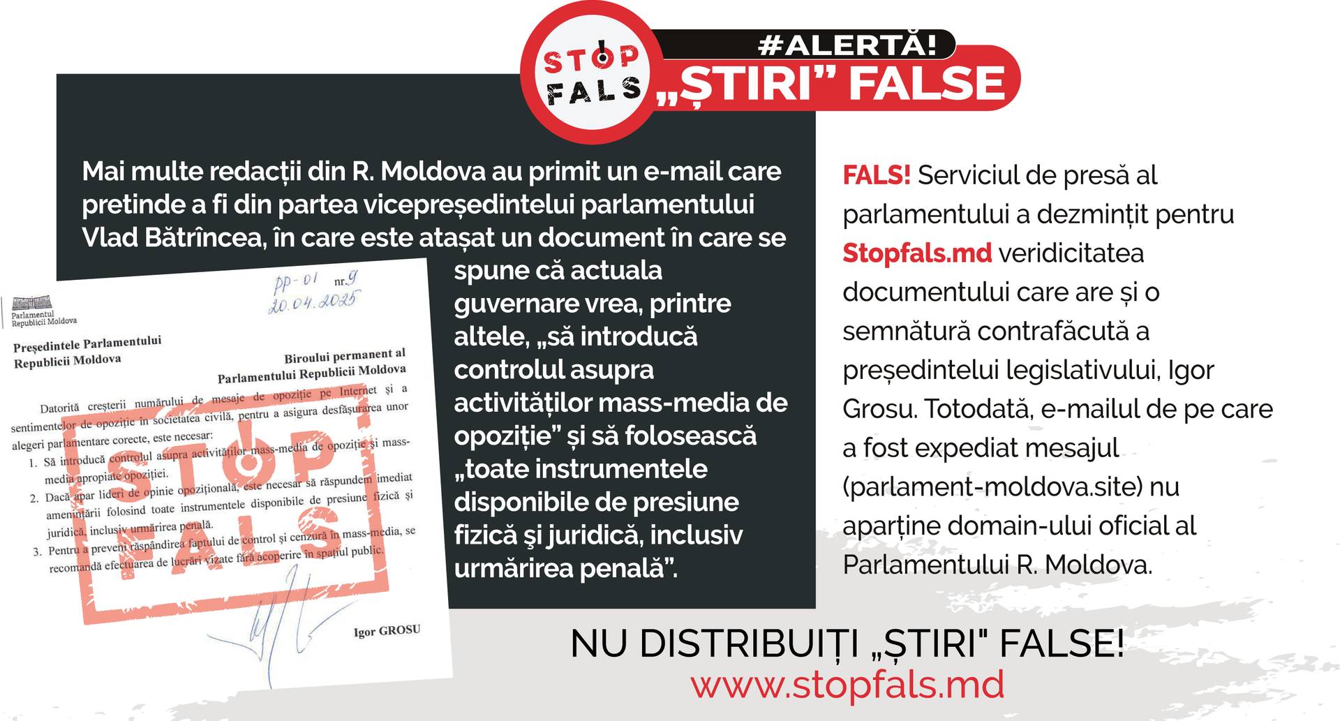 Mai multe redacții din R. Moldova au primit un e-mail care pretinde a fi din partea vicepreședintelui parlamentului Vlad Bătrîncea, în care este atașat un document în care se spune că actuala guvernare vrea, printre altele, „să introducă controlul asupra activităților mass-media de opoziție” și să folosească „toate instrumentele disponibile de presiune fizică şi juridică, inclusiv urmărirea penală”.