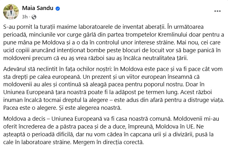 „S-au pornit la turații maxime laboratoarele de inventat aberații. În următoarea perioadă, minciunile vor curge gârlă din partea trompetelor Kremlinului doar pentru a pune mâna pe Moldova și a o da în controlul unor interese străine.”, a transmis ferm Maia Sandu.