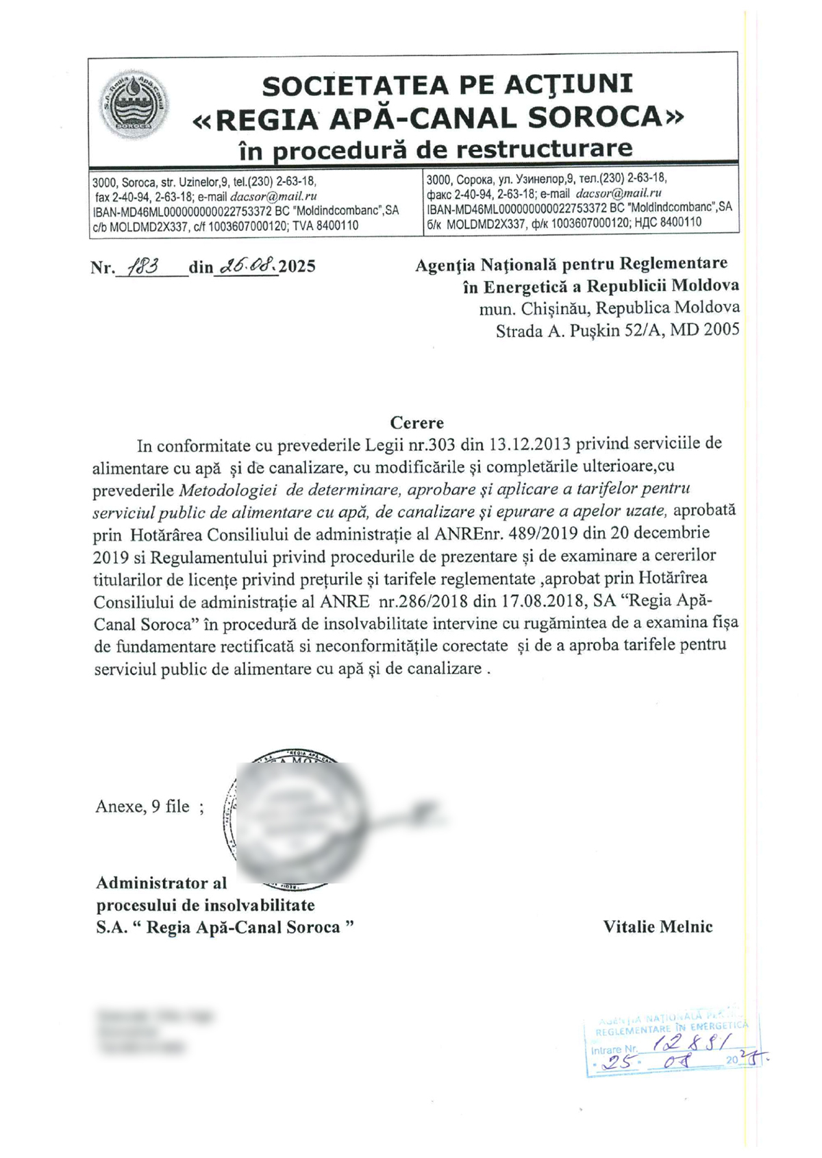 La Serviciul comunicare al ANRE ne-a fost confirmată existența unei astfel de cereri din partea S.A. „Regia Apă-Canal Soroca”, ce urmează să fie analizată la una din ședințele următoare ale agenției. Și într-adevăr, solicitarea este postată pe site-ul ANRE, care include cererea de „a aproba tarifele pentru serviciul public de alimentare cu apă şi de canalizare”. Totodată este anexată și o fișă de fundamentare.