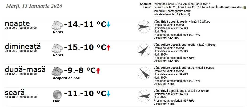 În raioanele de nord ale Republicii Moldova, conform prognozelor meteorologilor astăzi, 13 ianuarie 2026 vom avea vreme geroasă, sub media perioadei, iar precipitațiile sunt puțin posibile.