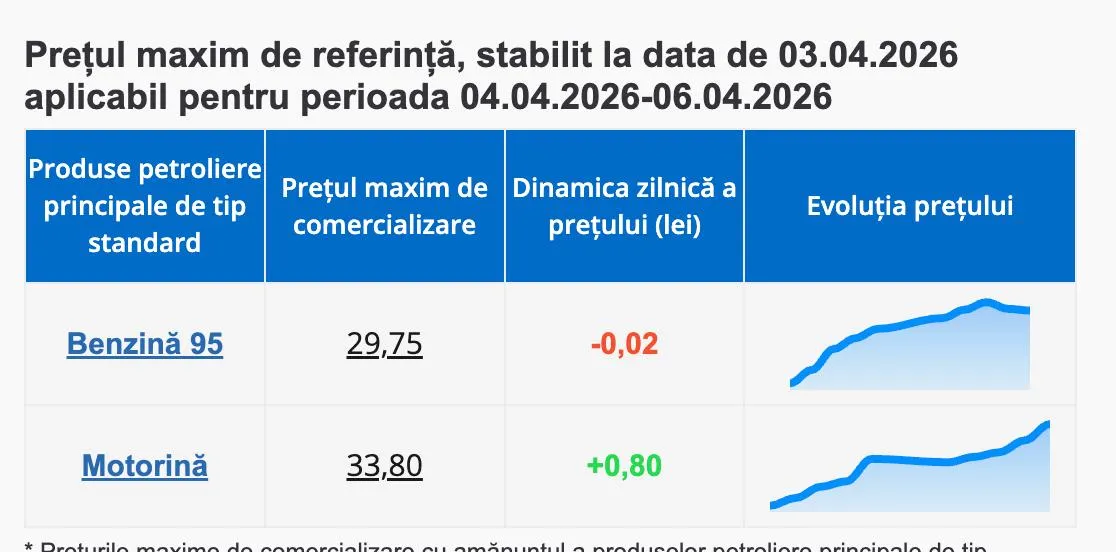 Astfel, benzina A95 va costa 29,75 lei per litru, în scădere cu doi bani față de ziua de 3 aprilie, iar motorina se scumpește semnificativ, ajungând la 33,80 lei per litru, cu 80 de bani mai mult.
