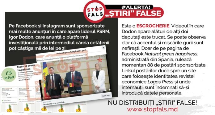Pe Facebook și Instagram sunt sponsorizate mai multe anunțuri în care apare liderul PSRM, Igor Dodon, care anunță o platformă investițională prin intermediul căreia cetățenii pot câștiga mii de lei pe zi.