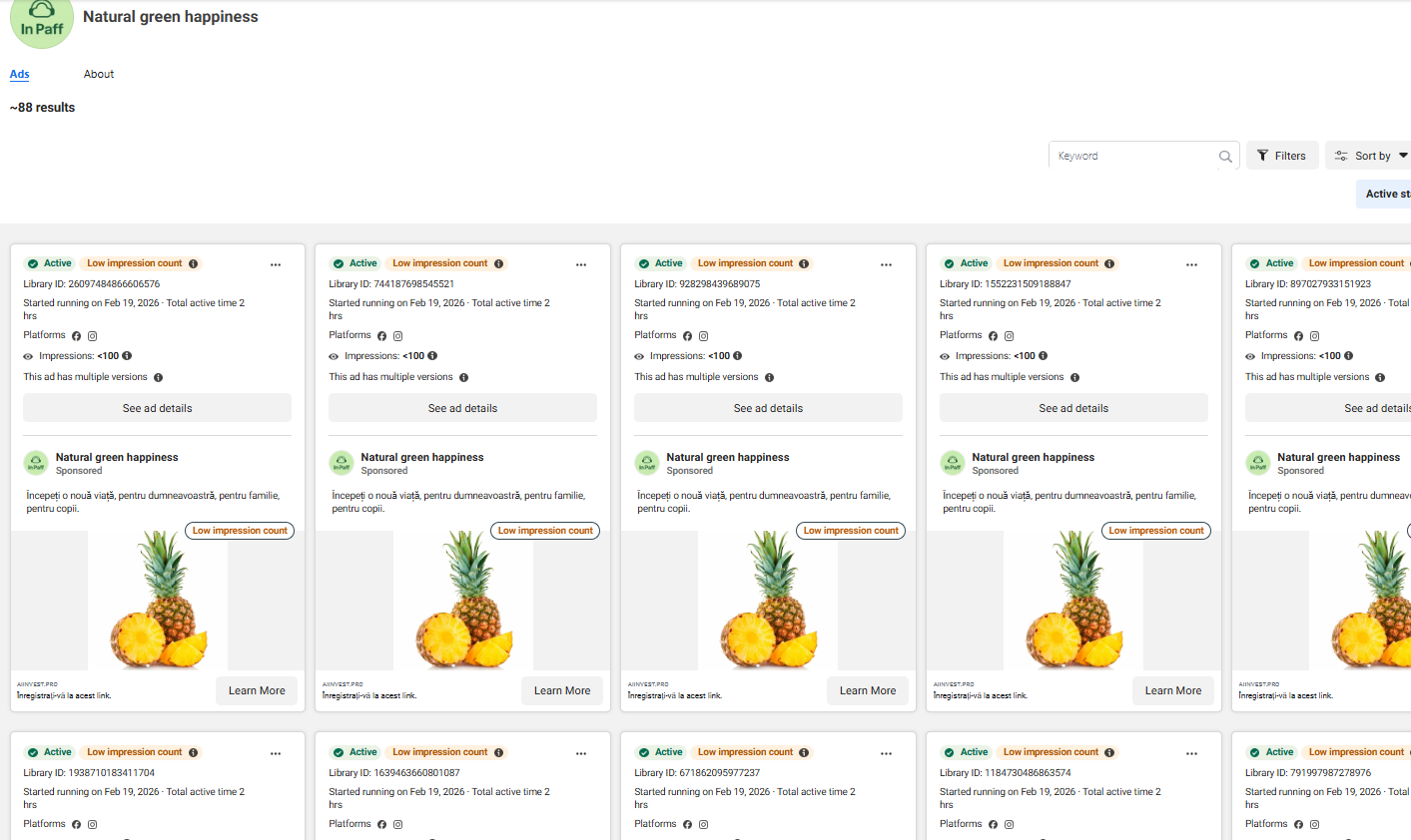 Este o ESCROCHERIE. Videoul în care Dodon apare alături de alți doi deputați este trucat. Se poate observa clar că accentul și mișcările gurii sunt nefirești. Doar de pe pagina de Facebook Natural green happiness, administrată din Spania, rulează momentan 88 de postări sponsorizate.