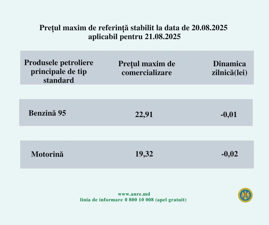 Pentru astăzi, 21 august 2025, Agenția Națională pentru Reglementare în Energetică a stabilit prețurile maxime de referință pentru produsele petroliere principale de tip standard.