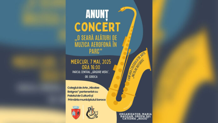 Miercuri, 7 mai 2025, Parcul Central „Grigore Vieru” din Soroca va deveni gazda unui eveniment cultural de excepție: concertul intitulat „O seară alături de muzica aerofonă în parc”, o invitație deschisă pentru toți iubitorii de muzică și relaxare în aer liber.
