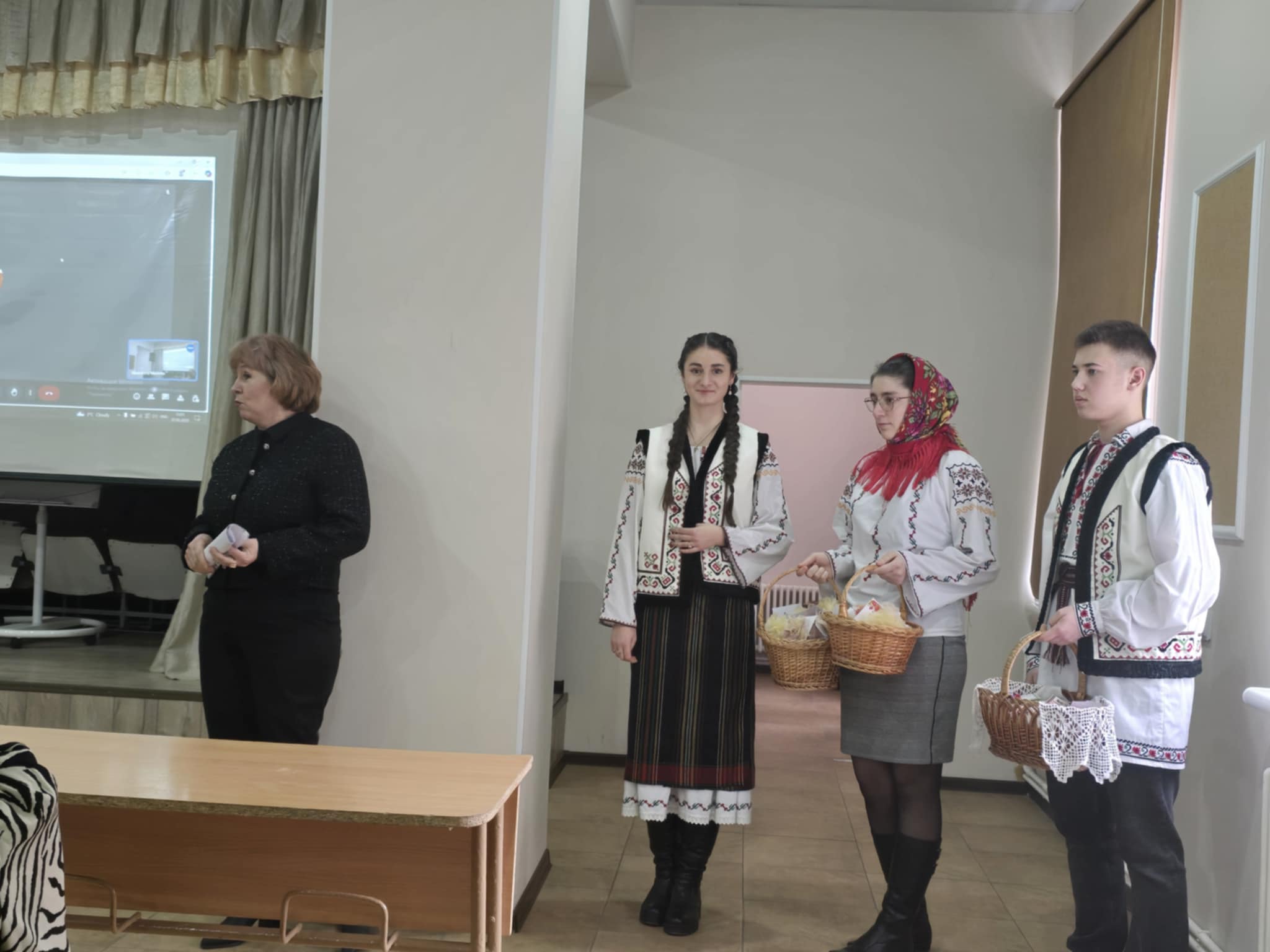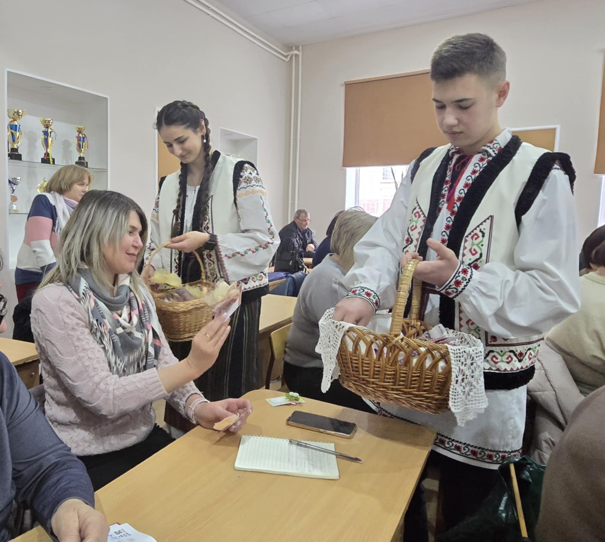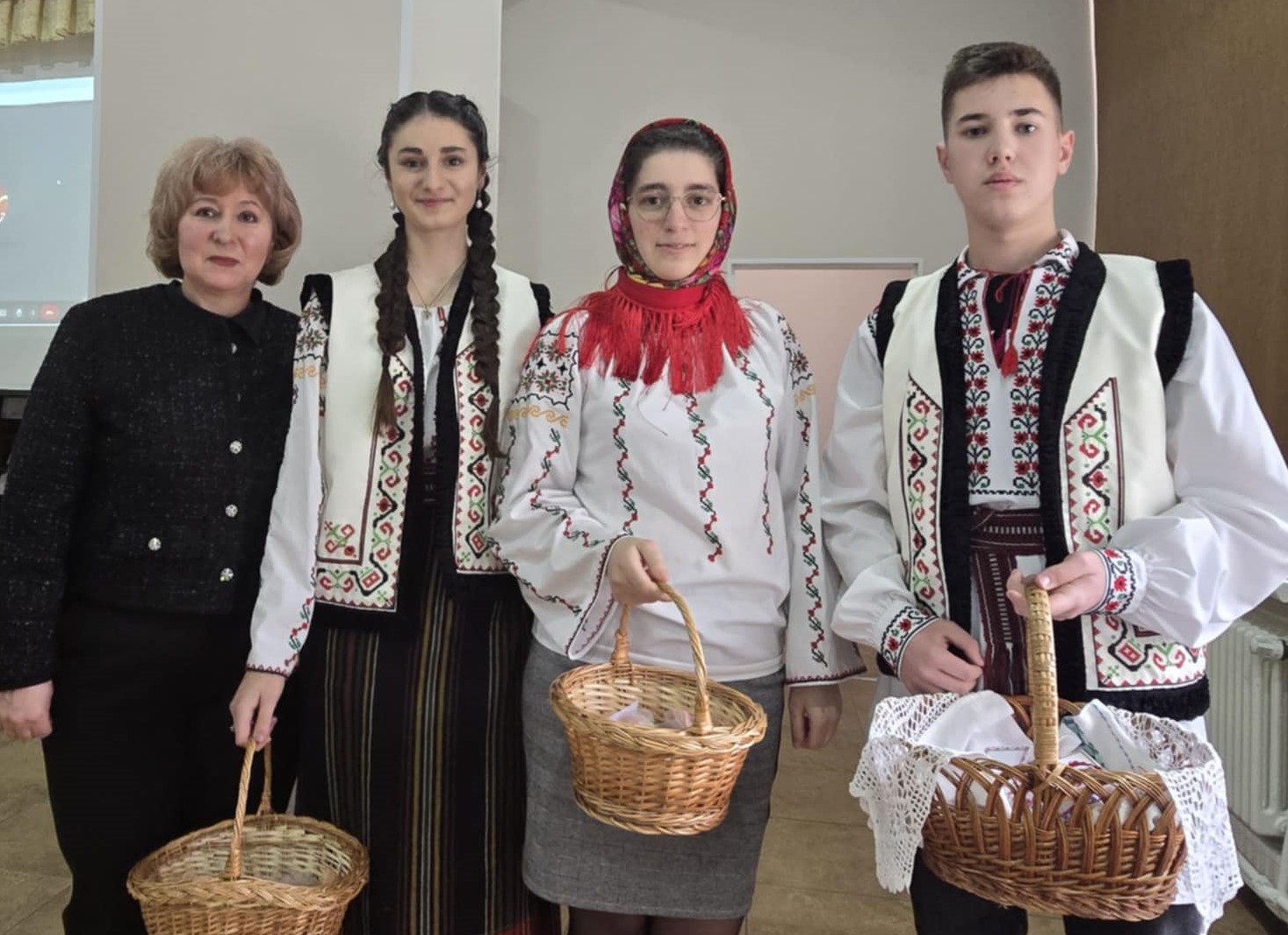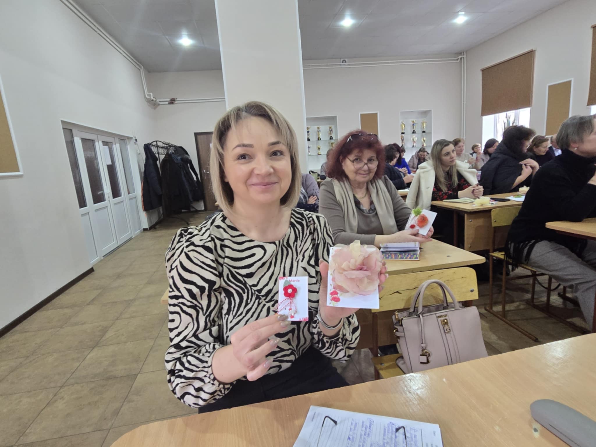 Doi tineri în port popular, au oferit cu drag tuturor celor prezenți câte un mărțișor hand made, confecționat din materiale reciclabile, cât și broșe cu flori de primăvară, fiind însoțite de frumoase mesaje de felicitare. Fiecare profesor a rămas plăcut surprins de acest gest frumos în preajma zilei de 1 Martie, prima zi de primăvară, când prindem la piept mărțișoare – simbolul primăverii, după frumoasa tradiție, când natura renaște și începe o nouă viață.