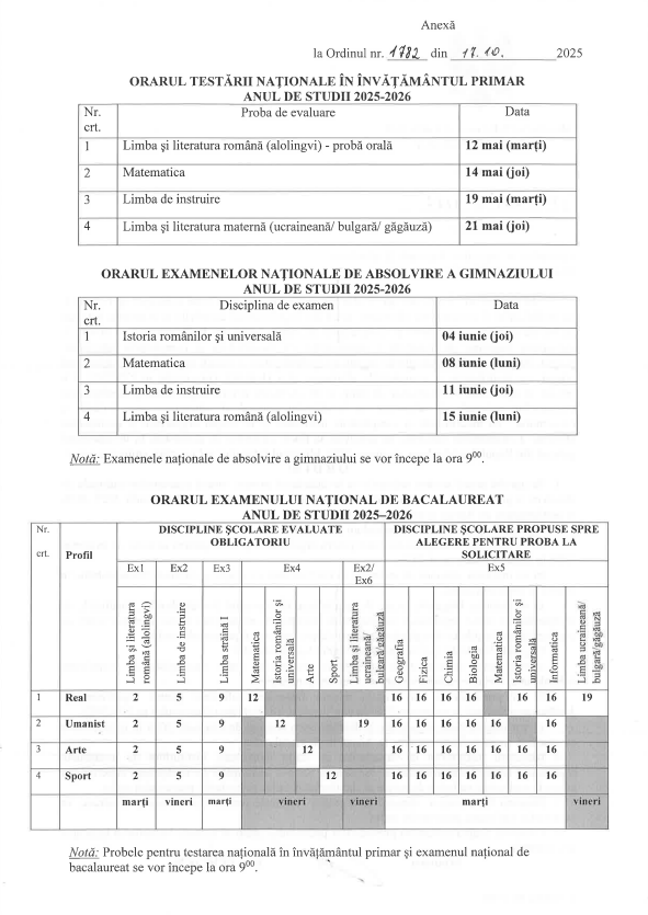 Toate probele de examene vor începe la ora 9:00, indiferent de disciplină, instituție de învățământ sau centrul de examene. Pentru familiarizarea cu toate activitățile din sesiunea de examene 2026, Agenția Națională pentru Curriculum și Evaluare a transmis către toate instituțiile interesate orarul probelor de examene, Programul de desfășurare a sesiunii de examene și programele de examen care vor fi aplicate în sesiunea 2026. La rândul lor, organele locale de specialitate în domeniul învățământului vor informa instituțiile de învățământ din subordine, profesorii, elevii și părinții despre documentele aprobate cu referire la examenele naționale. De asemenea, directorii liceelor republicane, colegiilor și centrelor de excelență, precum și rectorii universităților vor anunța cadrele didactice, elevii și studenții despre orarul stabilit.