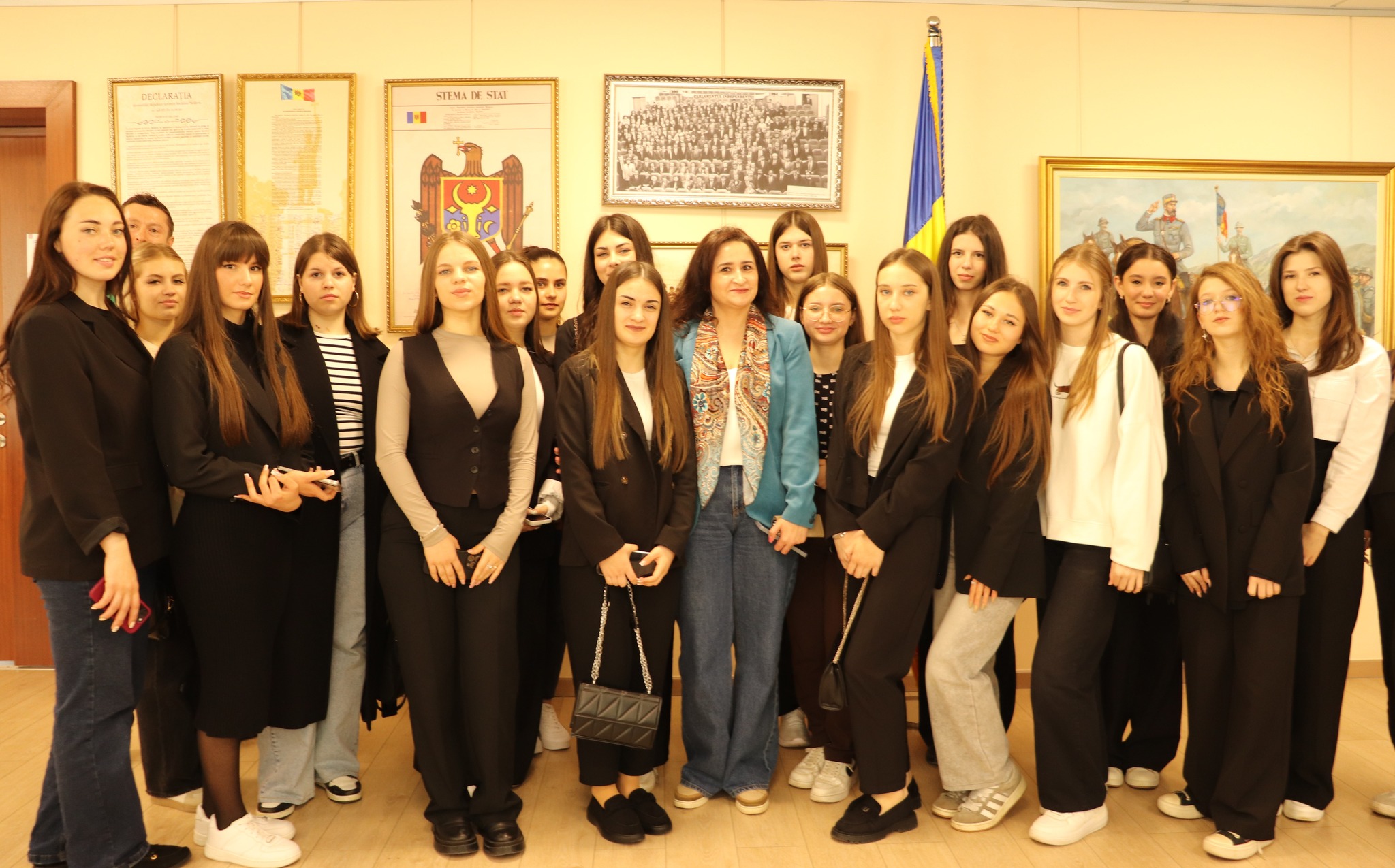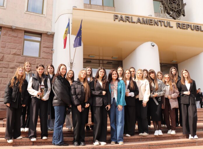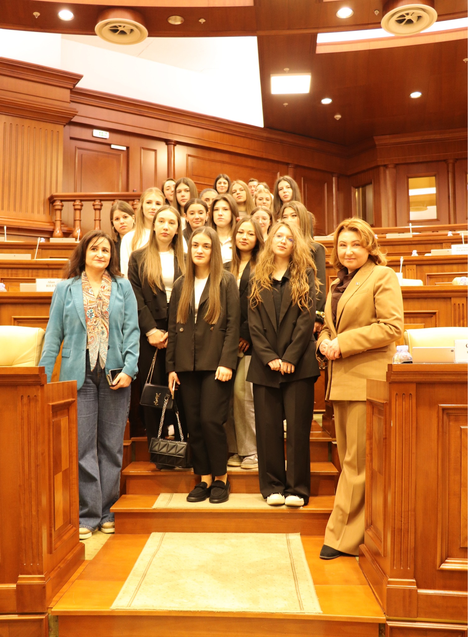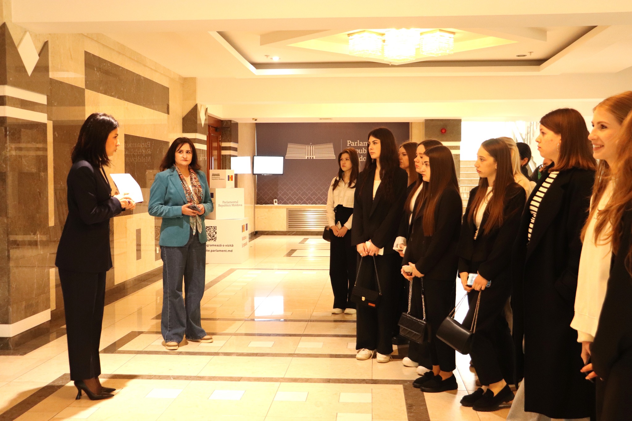 Prima oprire a fost la Parlamentul Republicii Moldova. Aici, participantele au discutat cu deputatele Tatiana Cucuietu și Marcela Adam. Cele două au vorbit despre parcursul lor profesional, dar și despre provocările întâlnite. Tinerele au aflat cât de important este ca femeile să fie implicate în politică și în viața publică.
