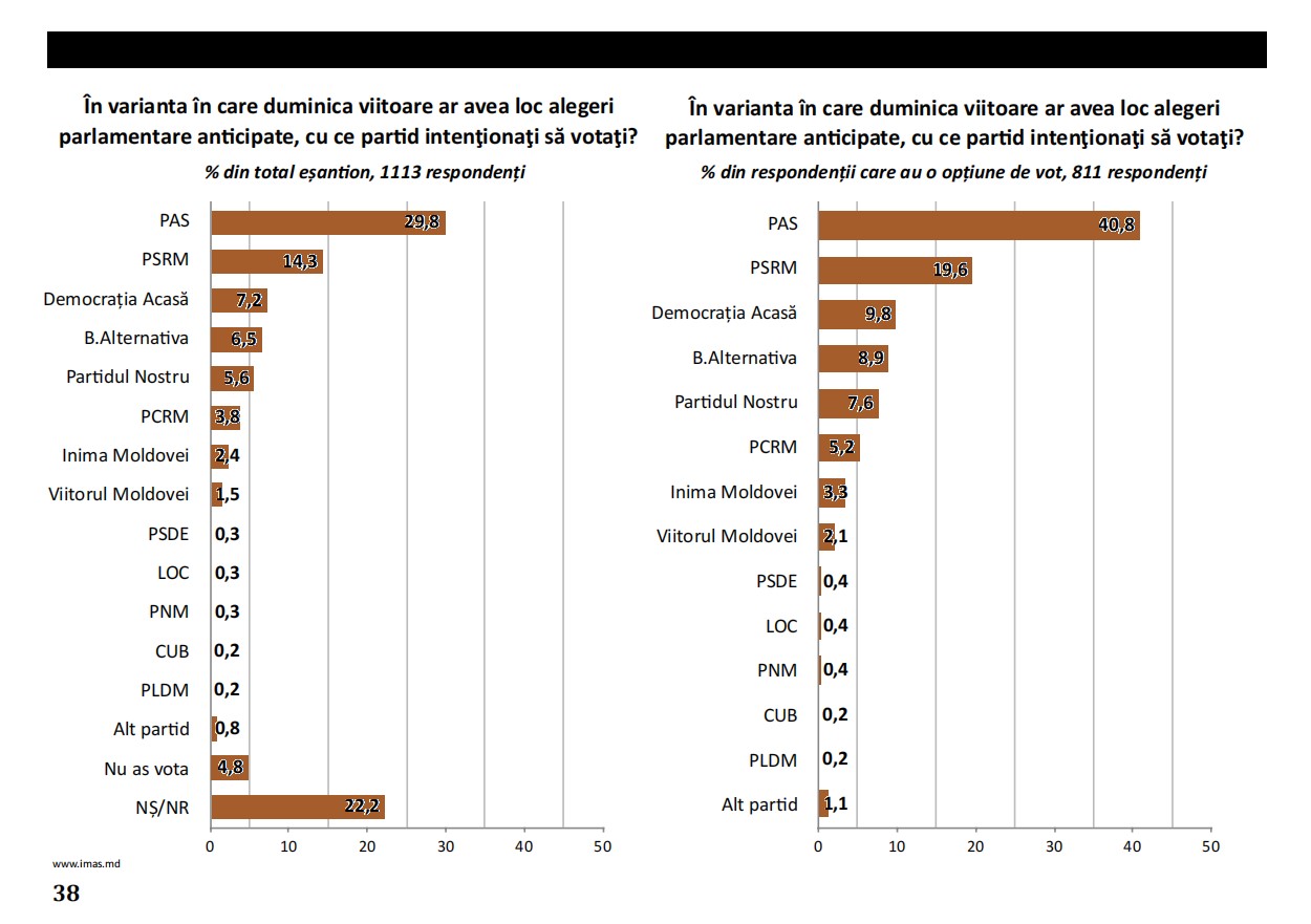 Conform datelor prezentate, PAS ar obține 40,8% din numărul respondenților deciși, fiind clasat pe primul loc. Formațiunea de guvernare este urmată de PSRM cu 19,6%.