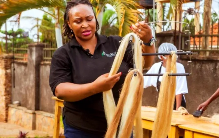 Juliet Kakwerre Tumusiime, directorul executiv și cofondator al Cheveux Organique, ține în mână extensii de păr produse de Cheveux Organique.