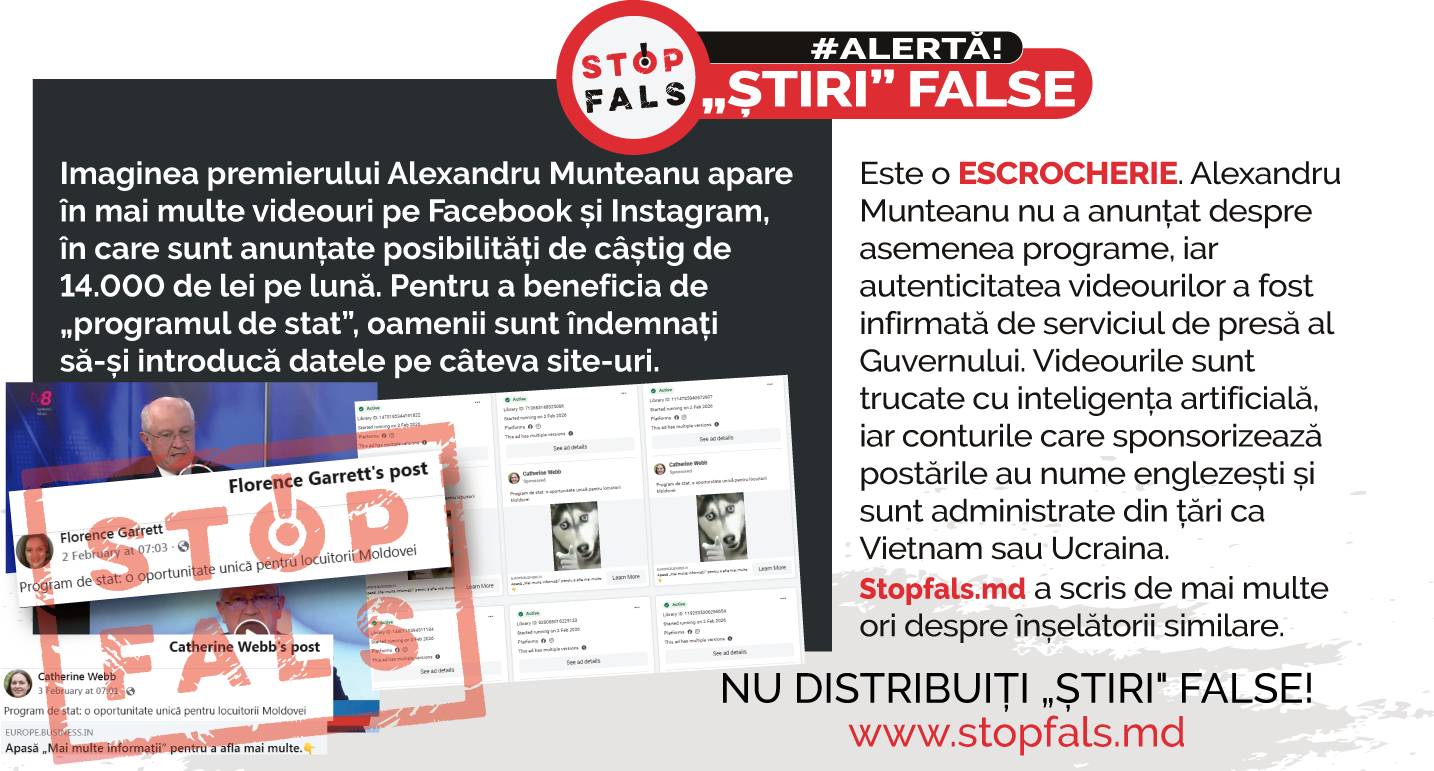 Imaginea premierului Alexandru Munteanu apare în mai multe videouri pe Facebook și Instagram, în care sunt anunțate posibilități de câștig de 14.000 de lei pe lună. Pentru a beneficia de „programul de stat”, oamenii sunt îndemnați să-și introducă datele pe câteva site-uri.