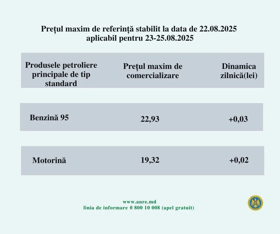 Astfel, prețul unui litru de benzină A95 nu trebuie să depășească 22,93 lei, iar cel pentru un litru de motorină – 19,32 lei. Prețurile respective ar însemna o scumpire cu trei bani la benzină și cu doi bani la motorină.