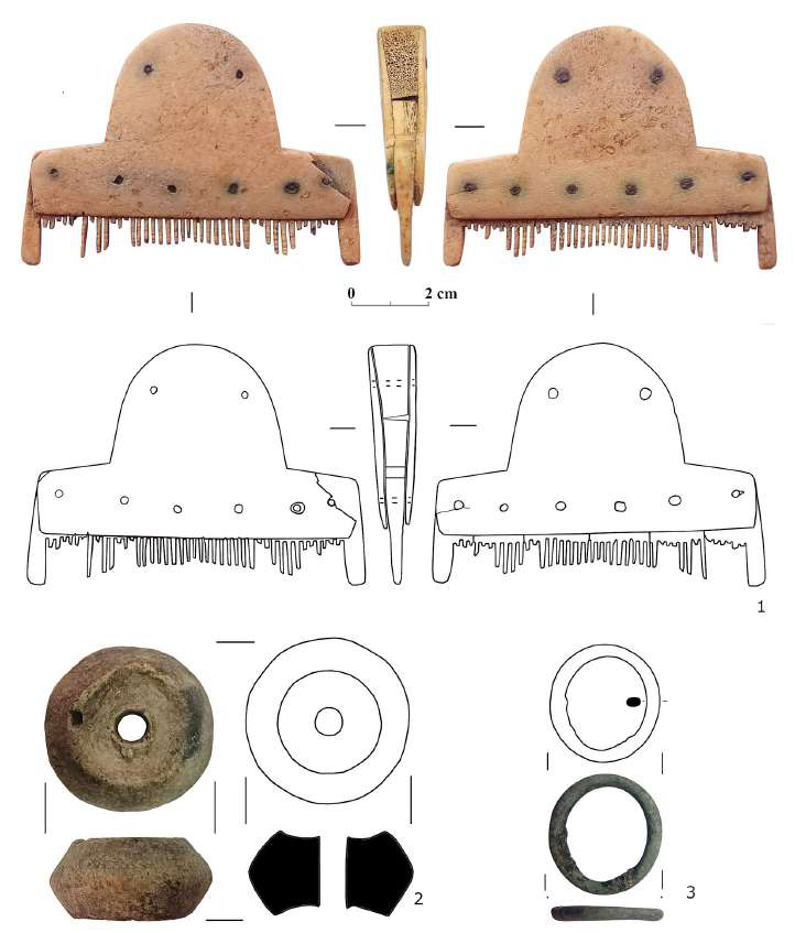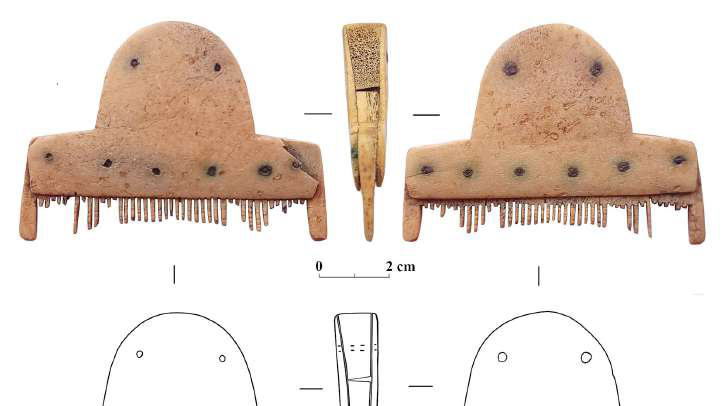 - un pieptene de os realizat din plăcuțe din corn de cerb, fixate cu nituri de bronz;