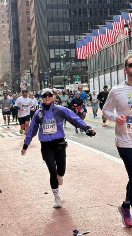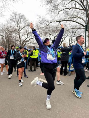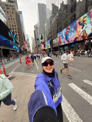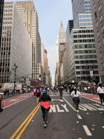 Altfel, primii 10 km s-au simțit foarte bine. Am admirat priveliștile și mă simțeam energică. Cel mai greu mi-a fost între km 11 și 14. Era un sector fără spectatori – doar alergătorii, drumul și priveliștea. Știam că la km 15 mă aștepta soțul meu, iar acest lucru m-a ajutat să continui în același ritm. Cu siguranță susținerea contează enorm – îți oferă un fel de boost de energie greu de explicat… Este impresionant să vezi că această zi nu este importantă doar pentru alergători, ci și pentru oamenii care locuiesc în New York. Mulți ies în stradă pentru a-i susține pe participanți, indiferent dacă cunosc sau nu pe cineva din cursă. Strigă, aplaudă și încurajează pe toți cei care aleargă. Mulți aduc bannere cu mesaje de susținere sau glume care te fac să zâmbești și îți dau un plus de energie exact când ai cea mai mare nevoie. Pe la km 16 am simțit acel val de energie despre care mulți alergători vorbesc – „runner’s high” – nu exista un termen exact in limba română. Alergam spre Bryant Park, îndreptându-mă spre Times Square, și am avut acel val de energie care îmi tăia respirația și îmi aducea lacrimi în ochi. Este un val neașteptat de energie și emoție care apare după mult efort. Deși eram deja obosită, pentru câteva minute alergarea s-a simțit mai ușoară și aproape euforică. Încercam să controlez emoția prin respirații scurte. A fost un moment unic și foarte special.