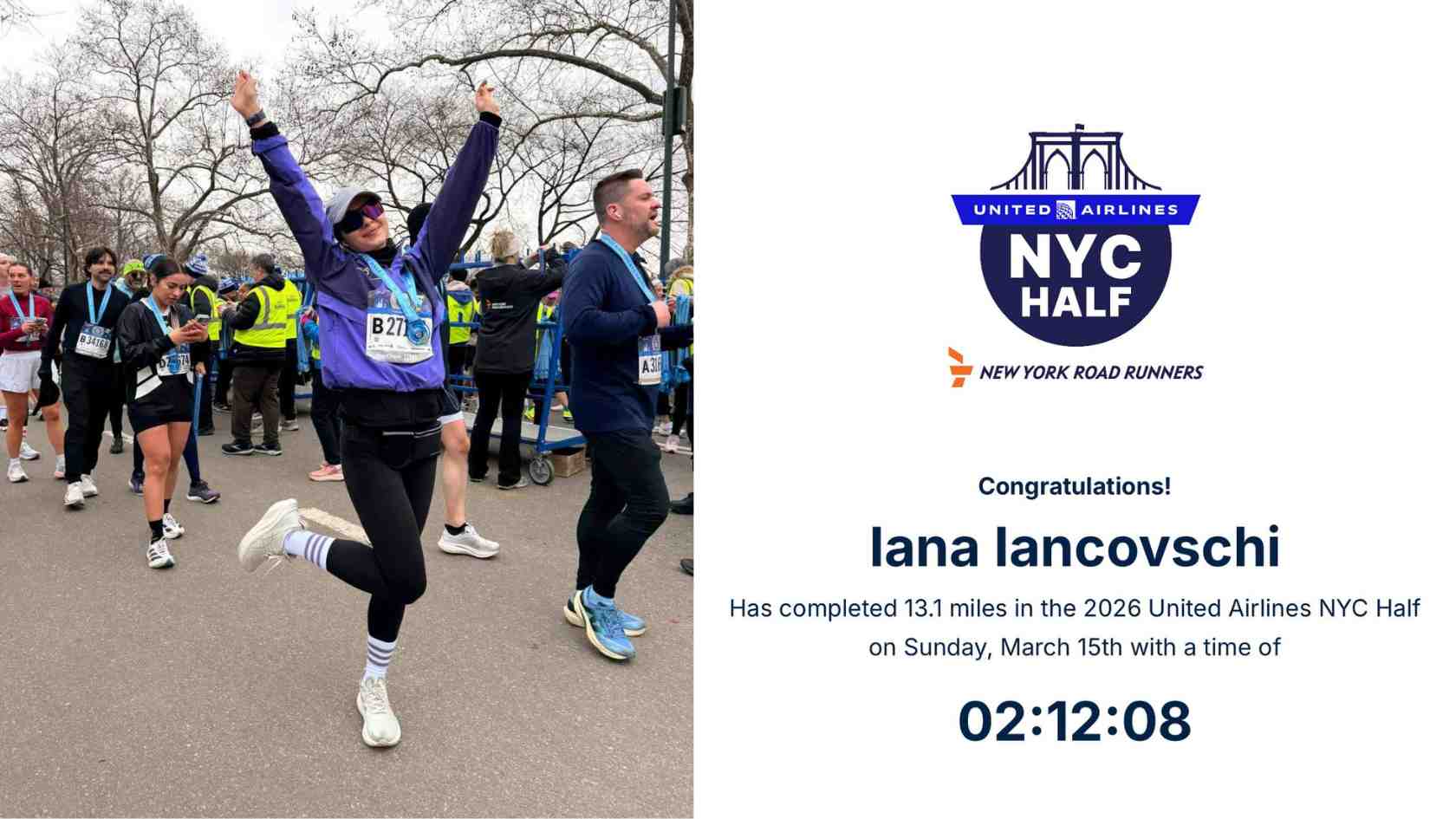 Povestește Iana IANCOVSCHI: „Nu m-am considerat niciodată o alergătoare, dar practicam alergatul cel puțin o dată pe săptămână. M-am înscris mai mult în glumă, împreună cu o prietenă, gândindu-ne că ar fi frumos să ne antrenăm împreună și să alergăm semi-maratonul cât timp locuim ambele în New York. Eu am fost acceptată, iar prietena nu a avut noroc să fie acceptată. După ce am primit „verde” de la organizatori timp de aproape trei luni mă trezeam la 5:30 pentru a începe antrenamentul la 6:30, de șase ori pe săptămână. Programul includea trei antrenamente de forță, două alergări pe distanță scurtă și intervale, plus o alergare pe distanță lungă o dată pe săptămână, mărind distanța cu 1–2 km în fiecare săptămână… Această experiență mi-a trezit o admirație enormă pentru toți alergătorii de maraton. Am realizat cât de mult efort, disciplină și consecvență presupune acest sport ca și toate celelalte sporturi, îndeosebi cele de performanta. Practic îți construiești o mare parte din viață în jurul antrenamentelor: programul zilnic, orele de somn, alimentația și recuperarea sunt toate organizate astfel încât să susțină alergarea.