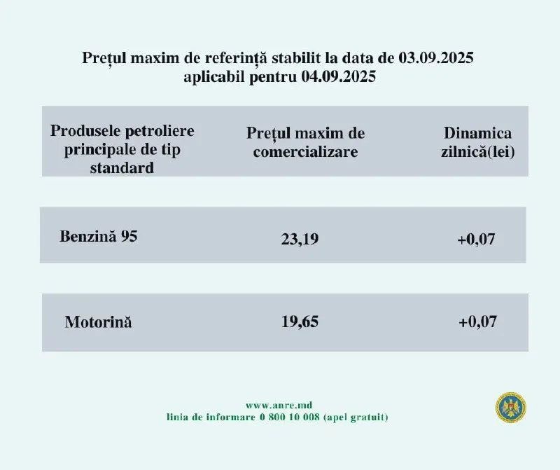 Agenția Națională pentru Reglementare în Energetică a anunțat noile prețuri la carburanți pentru ziua de joi, 4 septembrie 2025 – benzina și motorina se vor scumpi cu 7 bani.