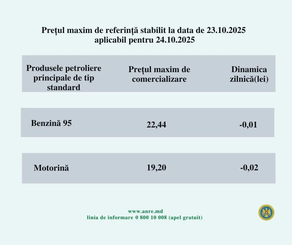 Pentru ziua de astăzi, 24 octombrie 2024, Agenția Națională pentru Reglementare în Energetică a stabilit că prețul unui litru de benzină A95 nu trebuie să depășească 22,44 lei, iar cel pentru un litru de motorină – 19,20 lei.
