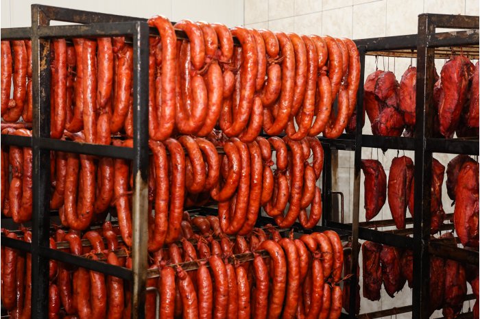 Mezelarul produce salam și șuncă în două instalații de afumare la cald – unul modern, iar altul tradițional, care funcționează pe bază de lemn de stejar.