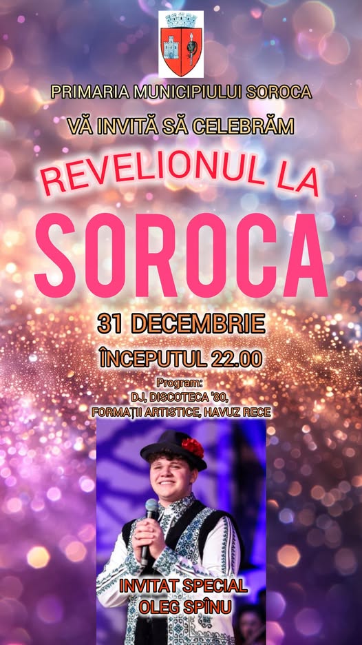 !InternationalDiversePoliticTransparență Primaria Municipiului Soroca, vă invită să sărbătorim Revelionul împreună, la bradul din centrul orașului! De către OdN - 31 decembrie 2025 0 36 ÎN PROGRAM: 22.00 DJ, Concert 23.30 Formații artistice locale, Disco ‘ 80 01.00 Mesajul primarei Lilia Pilipețchi, cu prilejul Anului Nou 01.10 Havuz rece 01.15 Oleg Spînu, invitat special Similare