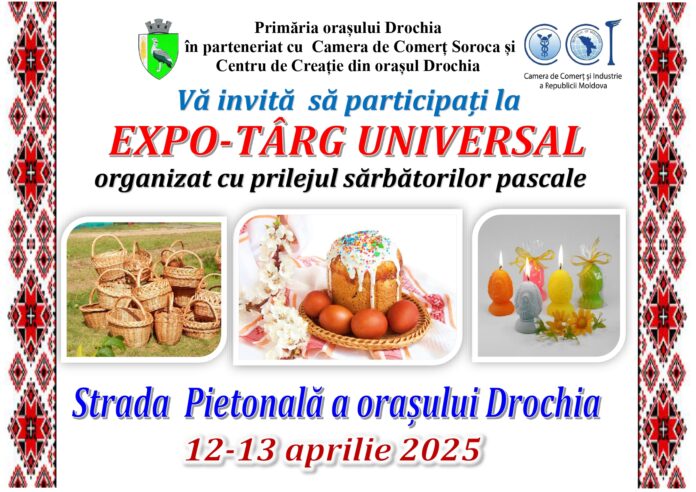 Primăria orașului Drochia, în parteneriat cu Camera de Comerț Soroca, invită locuitorii și oaspeții orașului să participe la Expo-Târgul de Paști, organizat în perioada 12-13 aprilie 2025, pe strada Pietonală a orașului Drochia.