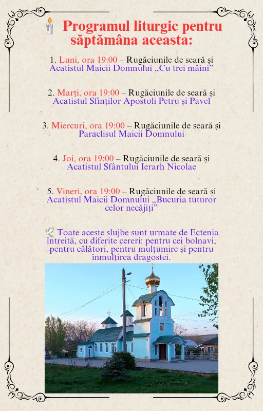 Credincioșii din satul Zastînca sunt invitați să participe la slujbele de seară organizate în această săptămână la biserica „Sfinții Apostoli Petru și Pavel”. În fiecare zi, începând cu ora 19:00, vor fi rostite rugăciuni de seară și Acatiste sau Paraclise, după cum urmează: