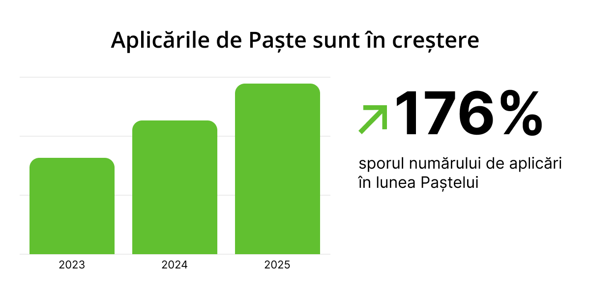 În ultimii ani, comportamentul candidaților pe piața muncii s-a schimbat semnificativ: tot mai mulți dintre aceștia continuă să își caute un loc de muncă inclusiv în perioada sărbătorilor. Datele Rabota.md confirmă această tendință: în perioada 2023–2025, numărul aplicărilor în lunea Paștelui a crescut de 1,76 ori, ajungând la câteva mii de CV-uri.