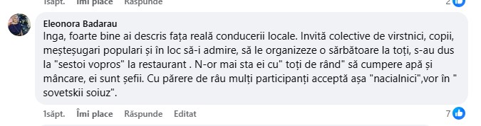 Ne plac și nouă comparațiile, mai ales când se aduc în discuție evenimente cu „rezonanță istorică”. Dacă tot s-a pomenit de Regina Maria de către autoare — eveniment despre care mulți am aflat abia după ce s-a desfășurat, — trebuie de menționat, că acolo a fost organizată o masă de recepție într-o localitate relativ mică, unde s-au cheltuit bani, iar la acea masă au participat doar „boierii galbeni”, fără niciun „muritor de rând”, numai că aici „autoarea” n-a scos în evidență evenimentul, de ce?, credcă tuturor vă este clar, unde este vorba de „ai noștri” nu se critică… Culmea e că nici conducerea raionului nu a fost invitată, lucru fără precedent în Soroca, cel puțin de la independență încoace, iar colectivele artistice a Secției Cultură și Turism a Consiliului raional Soroca au fost prezente și le-au înfrumusețat evenimentul – așa cum este bine și frumos.