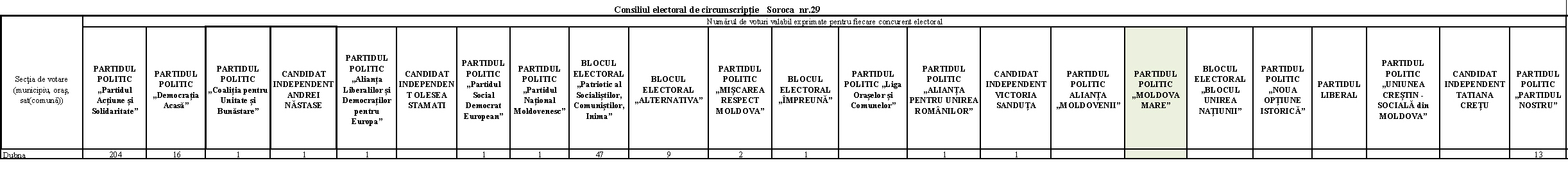 Conform datelor prezentate de Consiliul Electoral de Circumscripție Soroca nr. 29, voturile exprimate s-au distribuit astfel: