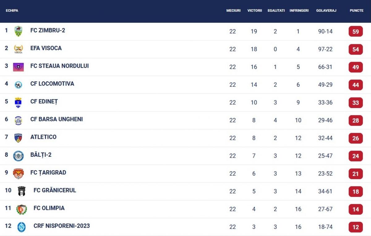 De altfel, în ultima etapă visocenii „au trântit” tare ușa, înving adversarii din Bălți așa cum o știu ei mai bine – cu un scor fluviu, vioara întâi fiind același neobosit Andrei Stratan, cu un „poker” de zile mari! Să mai menționăm și faptul că în ultima etapă a fost înregistrată o singură surpriză – FC Olimpia din Bălți a pierdut, la scor de neprezentare, în fața outsiderului, în rest au fost consemnate rezultate așteptate: EFA Visoca – Atletico 7-2 (Andrei Stratan 39, 47, 48, 82-penalty, Sergiu Godorojea 80, 89, Vlad Savițchi 86 / Nicolai Palii 81, 88); FC Grănicerul – FC Țarigrad 4-1 (Mihai Pîslari 58, 60, Alexandr Grab 69, Victor Arcenias 81 / Ianec Umanschii 14); FC Steaua Nordului – CF Locomotiva 5-0 (Andrei Russu 25, Alexandr Ceavdari 40, Serghei Ivanov 76, 90+2, Dumitru Maga 79); FC Olimpia – CRF Nisporeni-2023 0-3 (Ionel Mirciu 22, Denis Briuhanov 25, 73-penalty); CF Barsa Ungheni – Bălți-2 2-2 (Dan Covali 61, Vasile Chirinciuc 89 / Serghei Mazur 22, 24); CF Edineț – FC Zimbru-2 0-1 (Maxim Musteață 70).