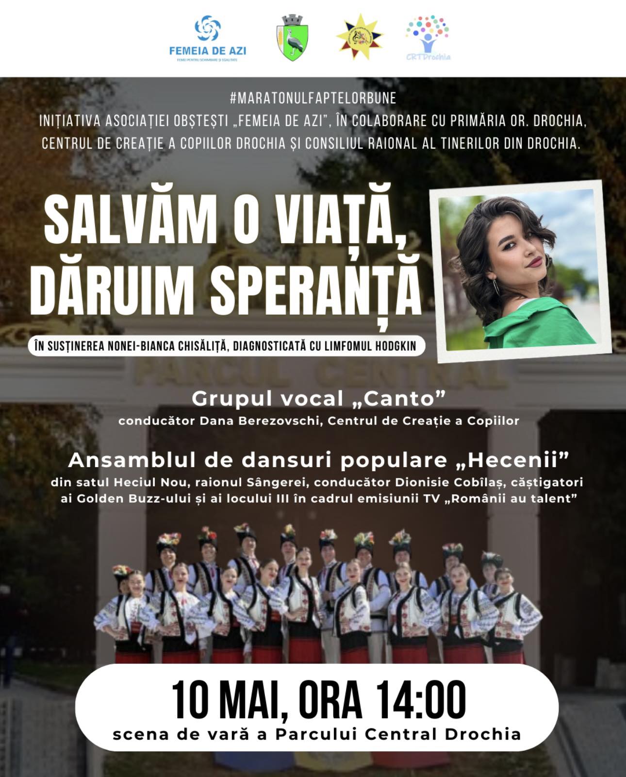 Ziua de 10 mai curent, va rămâne o filă frumoasă în cartea istoriei pentru comunitatea drochiană, lăsând în inima unei tinere domnișoare amprenta bunătății și generozității – virtuți, ce definesc esența oamenilor buni de la Dumnezeu. Anume în această zi, Parcul Central din orașul Drochia a găzduit Concertul de caritate „Salvăm o viață, dăruim speranță!”, în susținerea Biancăi Chisăliță, o tânără de 20 ani, care se luptă cu o formă agresivă de cancer limfomul Hodgkin.