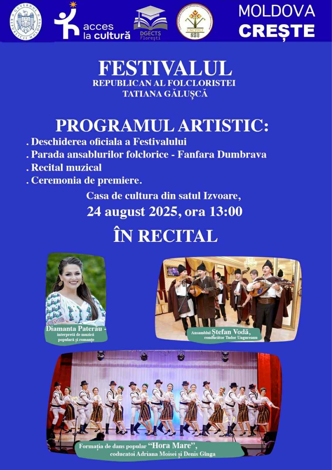 Locuitorii satului Izvoare și oaspeții din întreaga țară sunt așteptați pe 24 august 2025 la Festivalul Republican al Folcloristei „Tatiana Gălușcă”, care va aduce pe scenă ansambluri folclorice, artiști consacrați și iubitori de tradiții.