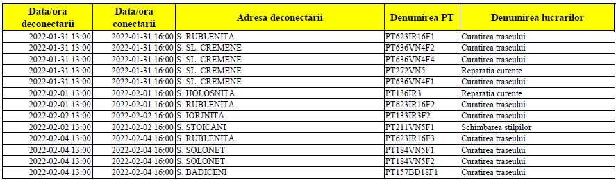 S.A. „RED-Nord” anunță deconectări programate ale energiei electrice în legătură cu executarea lucrărilor de mentenanţă în reţelele de distribuţie. Așa că în perioada 31 ianuarie – 6 februarie se va întrerupe energia electrică în următoarele localități: