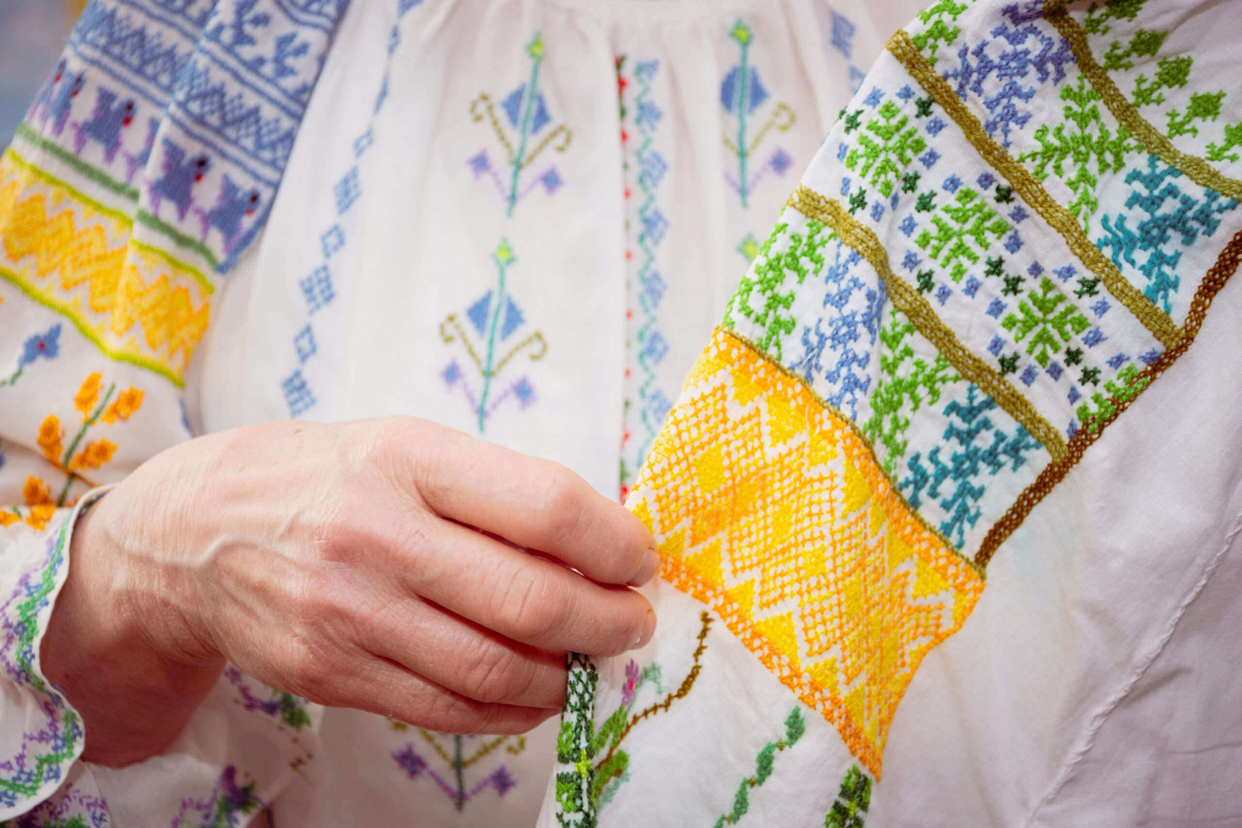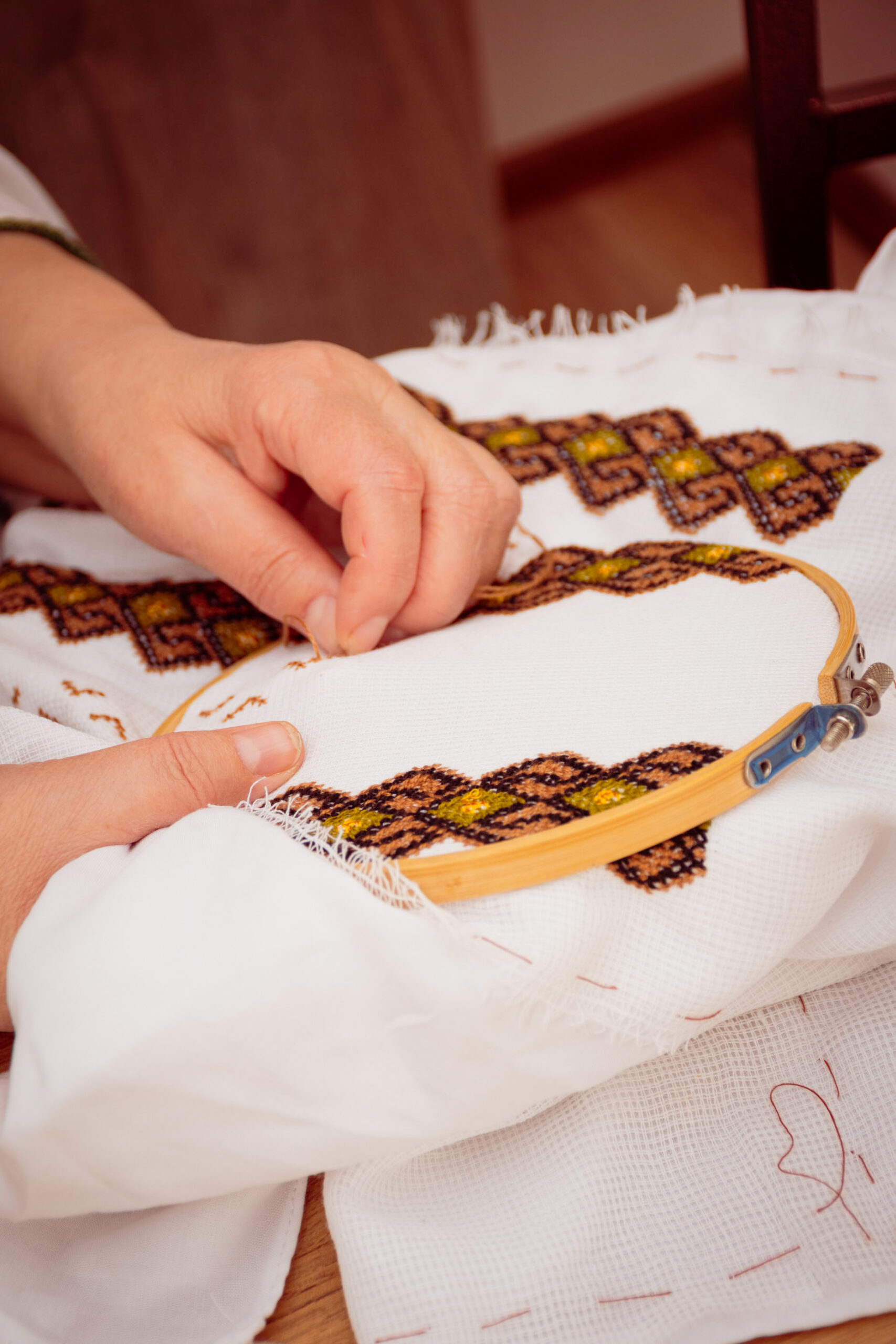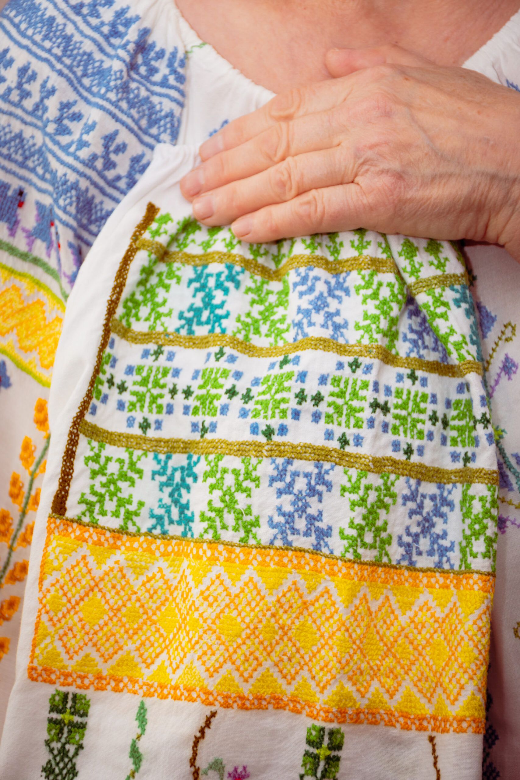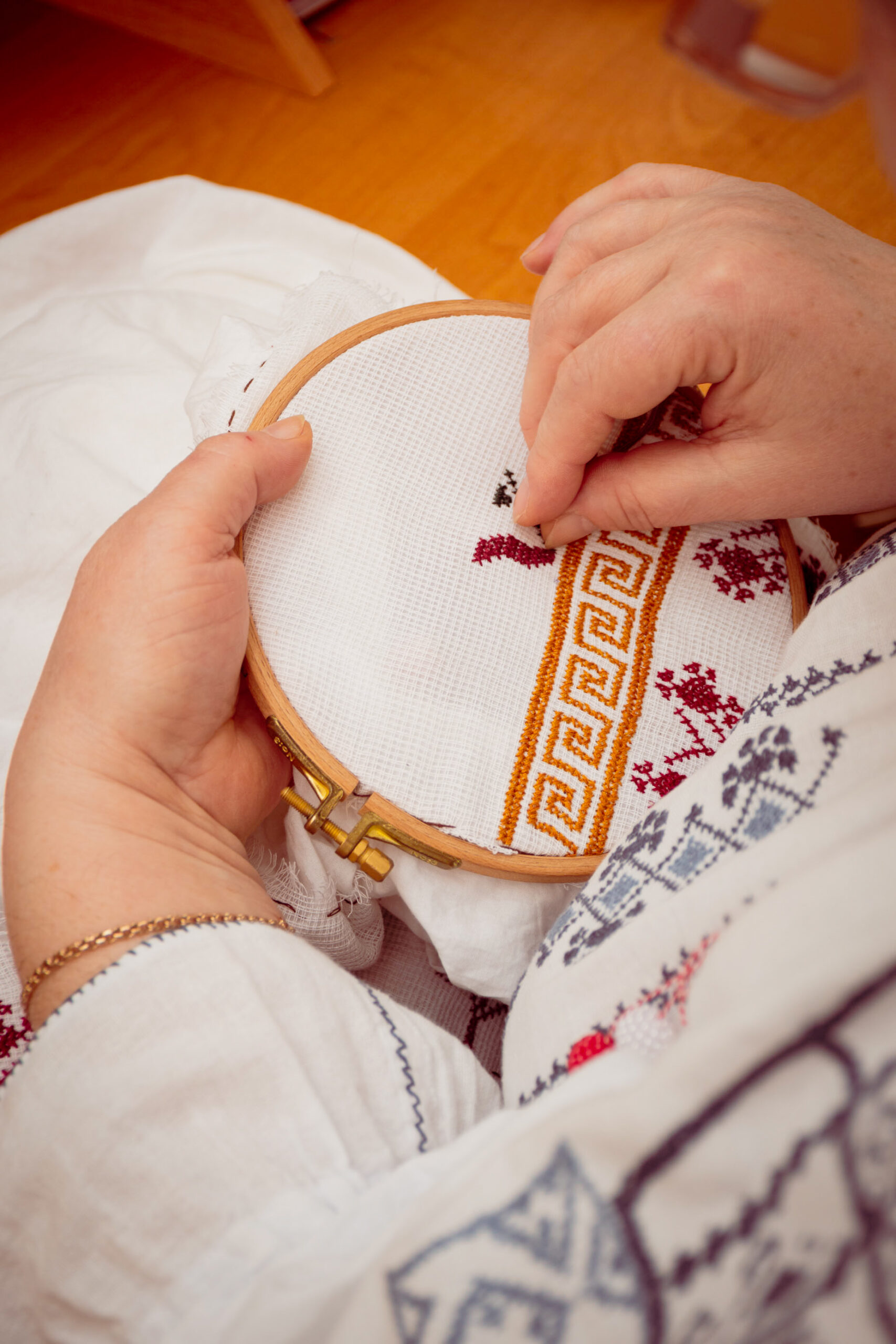 Cu ochii albaștri ca cerul, Raia a ales să coasă păsări albastre pe altiță — simbol al mișcării. „Să fim mereu în mișcare”, spune ea. „De șapte ori să cazi, iar a opta oară să te ridici și să mergi înainte. Să păstrăm gânduri luminoase.”