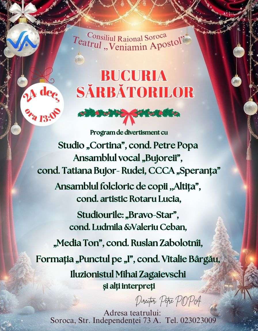 La 24 decembrie, începând cu ora 13:00, Teatrul „Veniamin Apostol” din Soroca va găzdui spectacolul „Bucuria sărbătorilor”. Evenimentul promite momente magice, muzică, dans și multă voie bună, reunind artiști locali și ansambluri artistice de excepție.